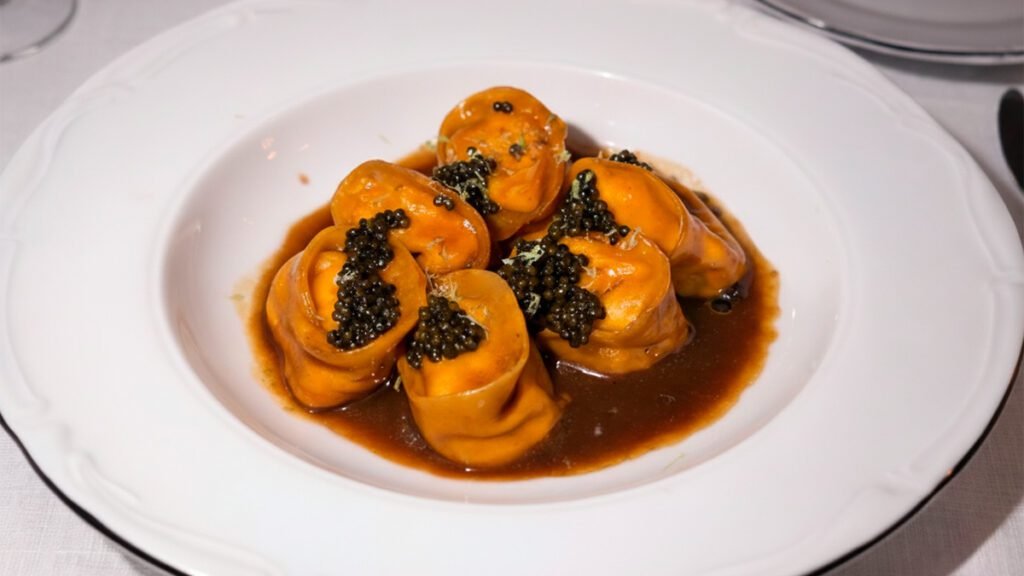 Seguimos con las mollejas de ternera, perfectamente cocinadas, jugosas y llenas de sabor, una elaboración que destaca por la calidad del producto y el punto exacto de cocción. A continuación, probamos los tortellini caseros con caviar, acompañados de una salsa delicada que potencia el relleno sin eclipsarlo, logrando una armonía redonda en boca.