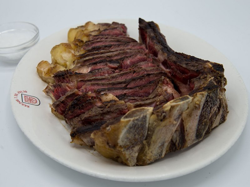 El chuletón de vacuno mayor madurado durante un mes (aprox. 1 kg) es mucho más que un plato: es una experiencia. Te traen la carne a la mesa junto con una parrilla de carbón para que puedas cocinarla a tu gusto, al punto exacto que prefieras y con la sal que tú mismo añades. Este ritual culinario, acompañado de patatas y pimientos, resulta perfecto para compartir y se convierte en el momento álgido de la velada.