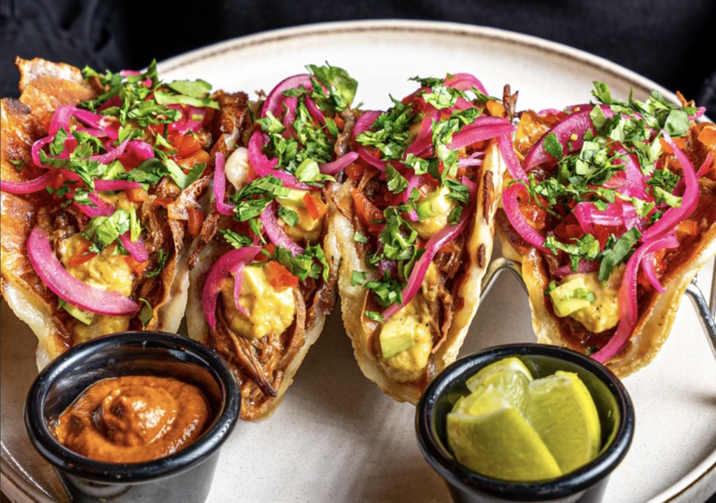 La tortilla de maíz llega gratinada, con esa textura crujiente que marca la diferencia entre un taco memorable y uno del montón. Sobre ella, brisket con reducción de sidra y BBQ, una combinación que equilibra lo ahumado, lo dulce y la acidez con precisión quirúrgica. La salsa secreta de la casa, el mix de aguacate, la cebolla encurtida, los pimientos rojos y el cilantro fresco completan una propuesta multicapa que no se parece a nada que hayas probado antes. Tortilla crocante, ingredientes en perfecta armonía: una opción única que justifica por sí sola la visita.