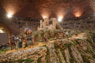El belén ocupa una plataforma circular de 40 metros cuadrados, diseñada para ofrecer una visión completa y proteger este valioso conjunto artístico. Está formado por más de 160 figuras sicilianas, con alturas entre 18 y 30 centímetros, elaboradas con un detalle minucioso que las convierte en auténticas piezas de museo.