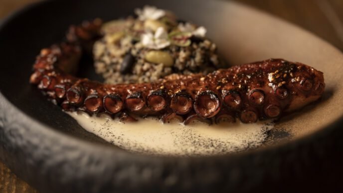 El momento cumbre de la velada llega con la costilla de vaca laqueada a baja temperatura. Cocinada durante horas hasta lograr una textura que se deshace en la boca, llega acompañada de un pan bao esponjoso y una salsa que equilibra notas dulces, ahumadas y especiadas en perfecta armonía. El punto final lo pone el camarero, que flamea el plato ante el comensal en un espectáculo visual que eleva la experiencia a otra dimensión. Este plato es, sencillamente, imprescindible.