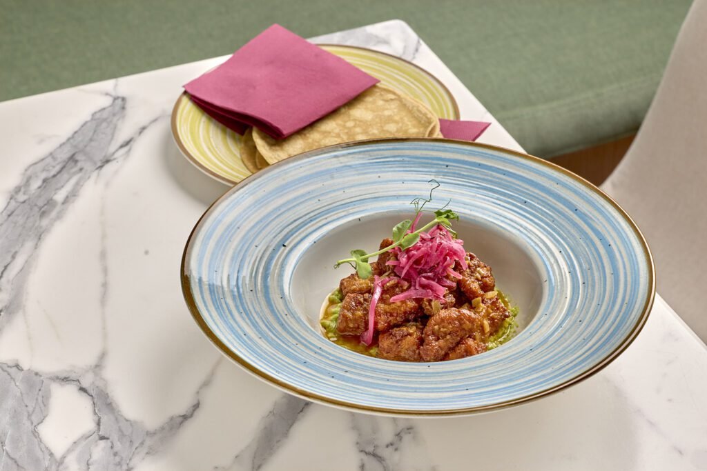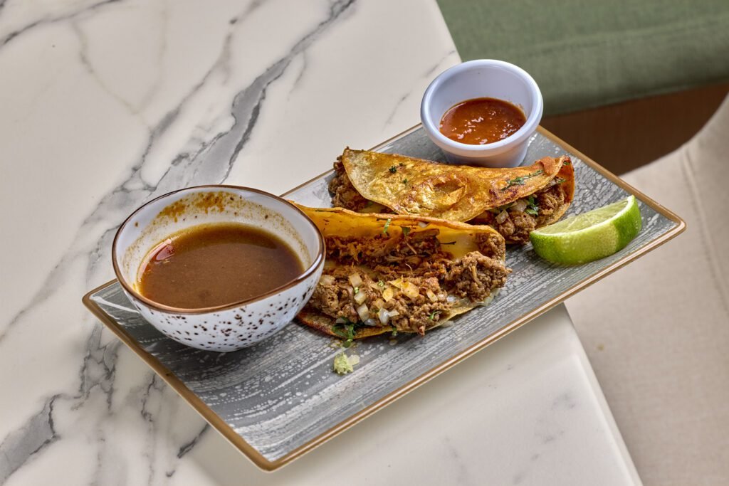 El ceviche mixto de pulpo y langostino y el de atún rojo con mango completan el apartado más marino de la carta, mientras que los tacos Gobernador, estilo Baja, de Arrachera o de Chilorio apuestan por la diversidad regional, cada uno con su técnica y su lógica de sabor propia. Platos como las carnitas de atún sobre guacamole o el pescado al ajo con risotto de hongo demuestran que la cocina del norte mexicano puede articularse con una elegancia que no renuncia a sus raíces callejeras.