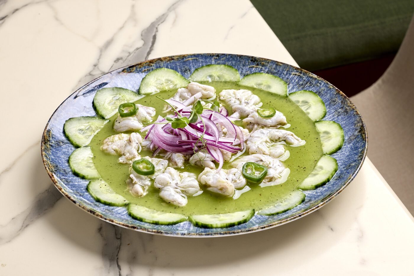 La propuesta gastronómica de Los Aguachiles pivota sobre el producto marino tratado con la precisión y la honestidad propias de la tradición costera del norte de México. El plato que da nombre al restaurante y que vertebra toda su identidad, es la máxima expresión de esa filosofía: langostino marinado en limón y chile, en cuatro versiones que recorren el espectro del picante y la complejidad aromática. El aguachile verde, el negro, el rojo y el de habanero con mango configuran una secuencia que invita a explorar matices, no simplemente a saciar el apetito.