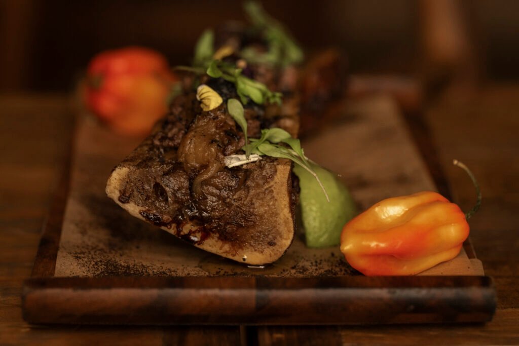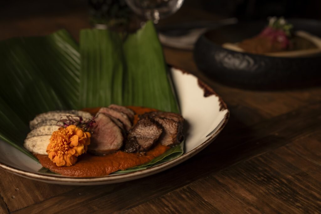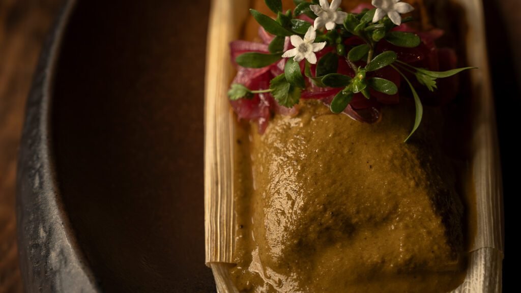 La experiencia arranca con los Tacos Cordillera, elaborados con solomillo y tuétano. En el momento en que llegan a la mesa, el aroma ahumado lo anuncia todo: son pequeñas obras maestras que se preparan en el momento, con cada bocado convertido en una delicia concentrada. A continuación, el Tamal con hojas verdes y una salsa que merece mención propia: uno de esos condimentos que uno querría poder llevarse a casa.