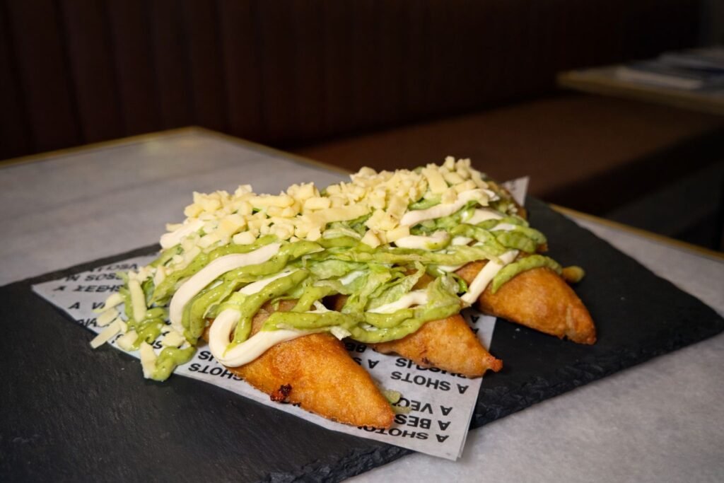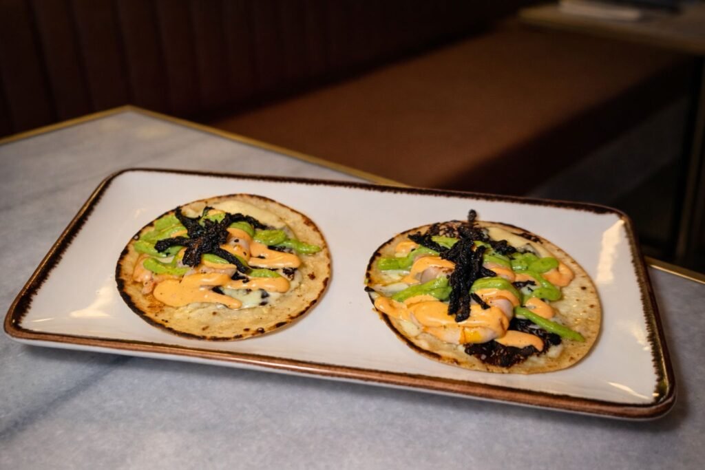 Los tacos, imprescindibles en cualquier mesa que se precie, brillan en dos versiones muy distintas. Los tacos de short rib presentan una carne brasada y desmechada en su jugo, espolvoreada de chicharrón; la jugosidad y el sabor de la carne resultan difícilmente olvidables. Pero si hay que elegir unos favoritos, los tacos diputado se llevan el título: langostinos salteados y gratinados con queso sobre tortilla de harina de trigo, con cebolla tempurizada en tinta de calamar y mayonesa. Una combinación valiente que, con las salsas de la casa, alcanza un equilibrio extraordinario.