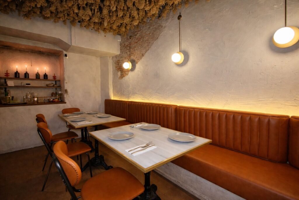 Lo primero que llama la atención al entrar es la ambientación. Para ser un restaurante mexicano, el espacio desconcierta y eso es precisamente su mayor virtud. Un techo cubierto de espigas de trigo convive con una decoración elegante pero sin excesos, creando un ambiente que podríamos calificar de mestizo en el sentido más literal del término: ni puramente mexicano, ni simplemente europeo.